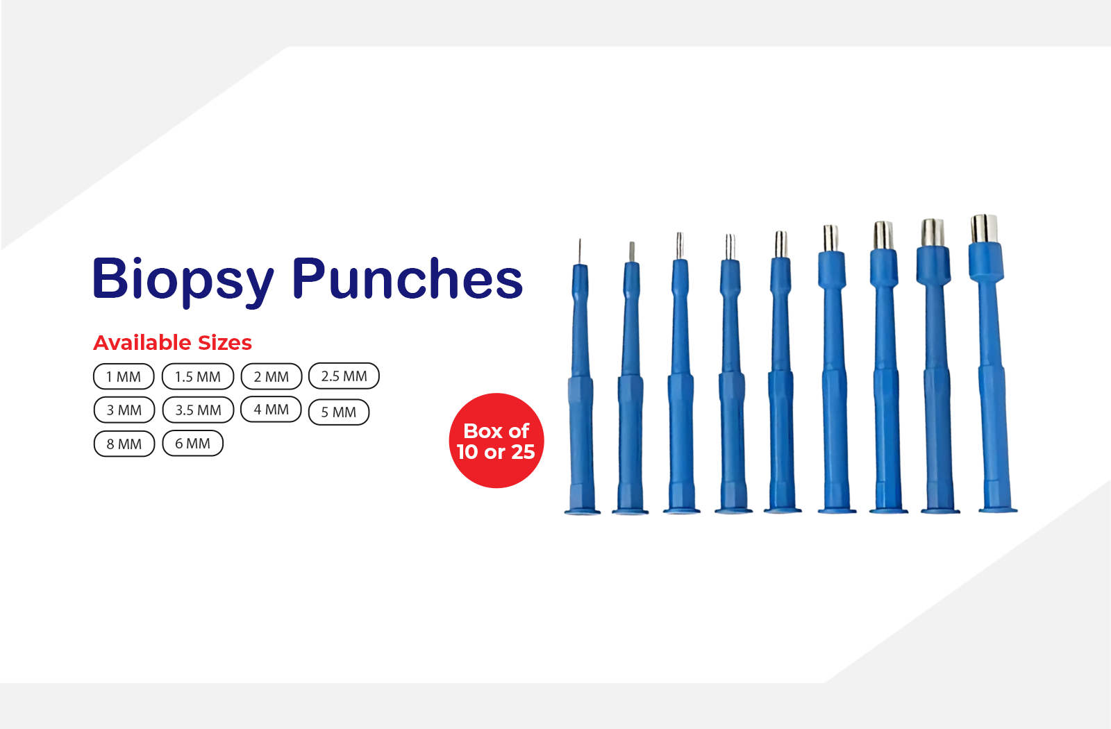 Our Biopsy Punches Variety Pack offers 10 precise sizes (1–8mm), each sterile, seamless, and sharp. Designed with protective tips for safe, accurate use in dermatology, labs, and clinical procedures.
